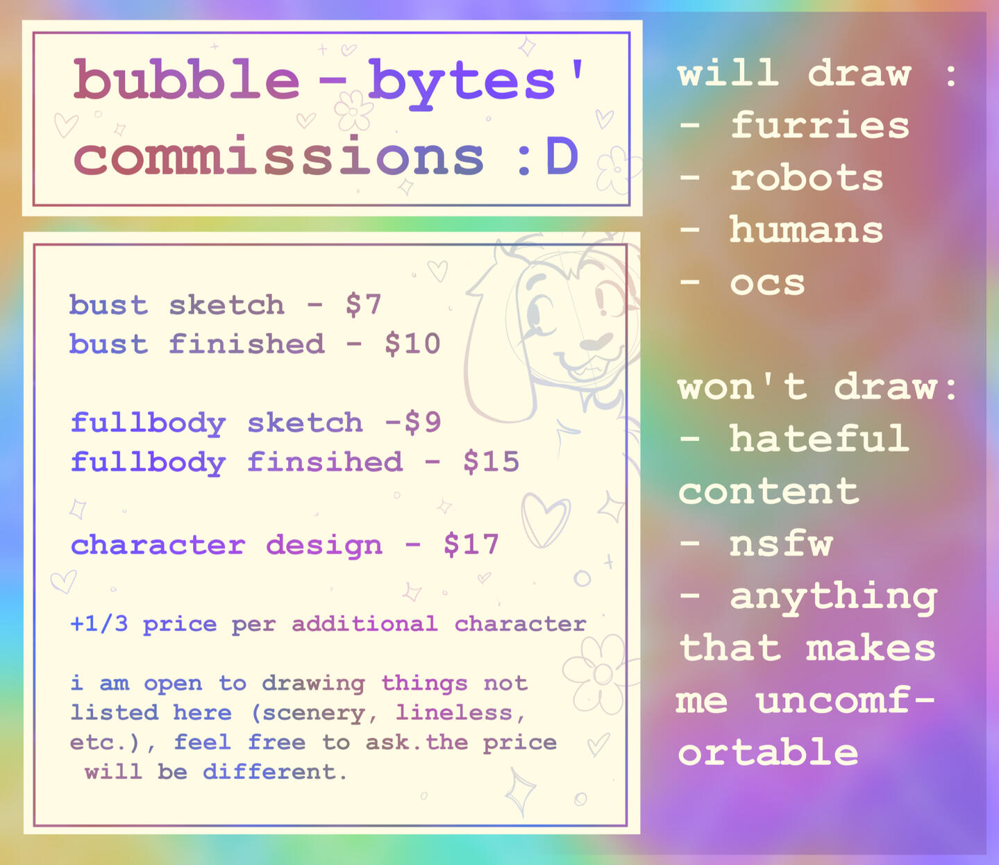 character design - $17+1/3 price per additional character.i am open to drawing things not listed here (scenery, lineless, etc.), feel free to ask. the price will be different.will draw: